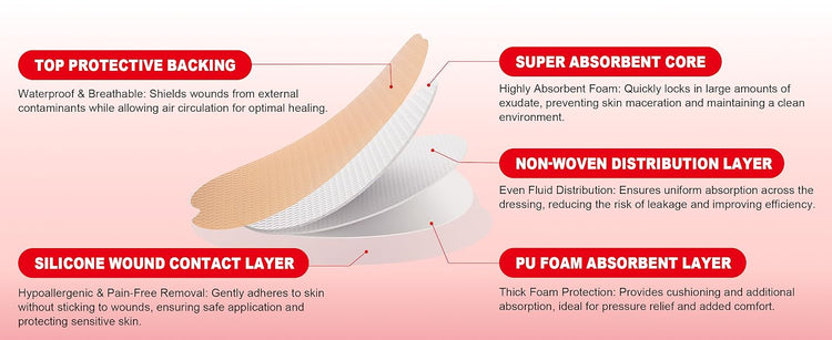 Silicone foam dressings are advanced wound care solutions designed to provide gentle adhesion, effective absorption, and lasting comfort. Featuring a soft silicone layer, these dressings minimize pain and skin damage during removal while protecting fragile skin and reducing the risk of MARSI (medical adhesive–related skin injury). The absorbent foam core manages varying levels of exudate, keeping wounds moist and supporting faster healing. Whether you are seeking reliable protection, enhanced healing outcomes, or simplified wound monitoring, silicone foam dressings offer a proven and versatile solution.